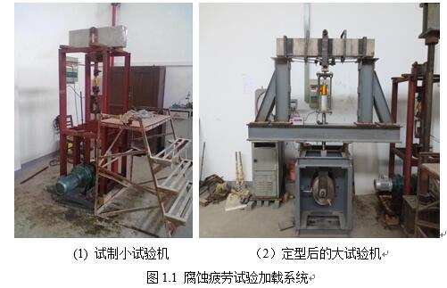 混凝土梁腐蝕疲勞試驗(yàn)系統(tǒng)分為動(dòng)力設(shè)備、計(jì)數(shù)設(shè)備、控制設(shè)備以及腐蝕箱等關(guān)鍵設(shè)備,能對(duì)尺寸較小的梁式試件進(jìn)行加載(圖1.1(1))。試制成功之后,又制作相同原理的另一套試驗(yàn)設(shè)備,能對(duì)大尺寸梁進(jìn)行加載(圖1.1(2))。