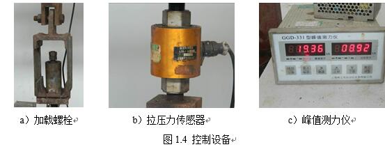 控制設(shè)備包括加載螺栓、力傳感器以及峰值測(cè)力儀等組成,見(jiàn)圖1.4。峰值測(cè)力儀采用上海梅立克自動(dòng)化儀表有限公司生產(chǎn)的型號(hào)為GGD-331峰值測(cè)力儀,力傳感器為5t的拉壓力傳感器。旋轉(zhuǎn)加載螺栓對(duì)加載最大荷載進(jìn)行控制,加載的最大荷載經(jīng)拉壓力傳感器的感應(yīng),從峰值測(cè)力儀顯示最大力。峰值測(cè)力儀左側(cè)顯示的是每次循環(huán)加載中的最大荷載(小于10kN不顯示),右側(cè)圍動(dòng)態(tài)顯示實(shí)時(shí)加載力。